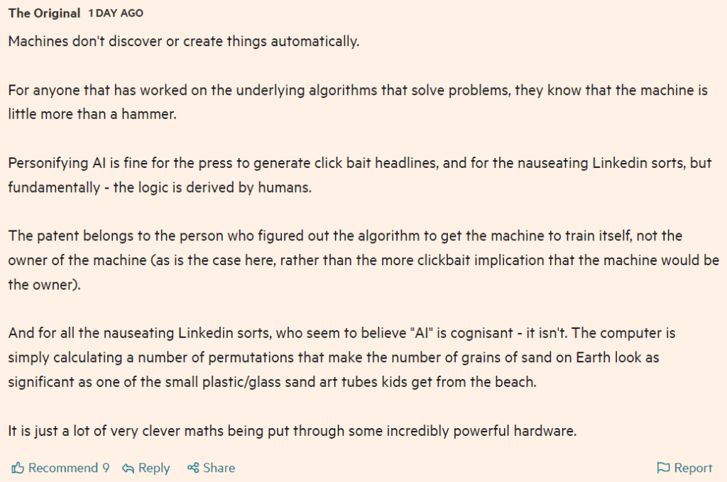 It should be noted that this ruling doesn’t consider many other factors. Basically, what we’ve learned is that AI does not equal a “natural person”, and the inventor of a patent application must be a natural person.